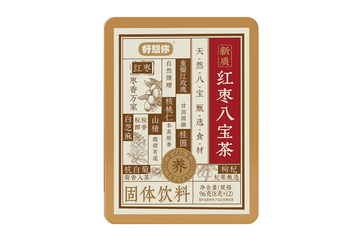 于是,团队精选八味天然食材:特级灰枣(补血养胃)重瓣红玫瑰(疏肝解郁)桂圆(安神补气)枸杞(明目抗衰)核桃仁(健脑润肤)山楂(消食降脂)杭白菊(清热降火)白芝麻(乌发润肠)